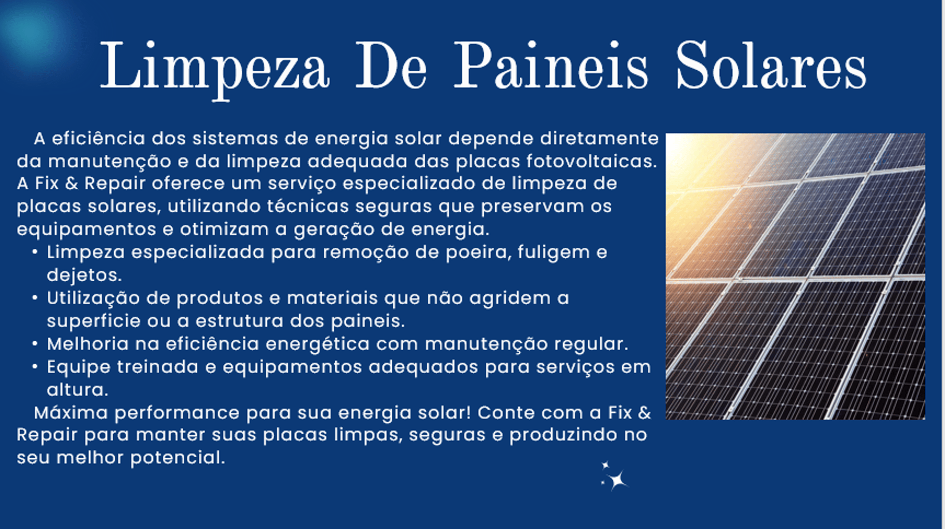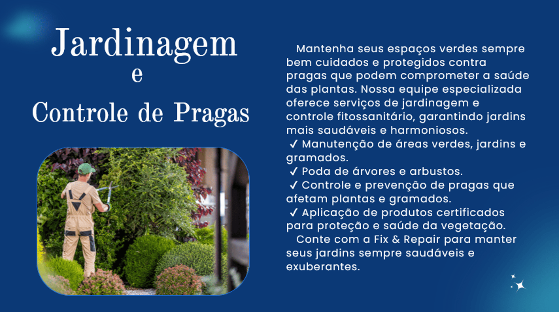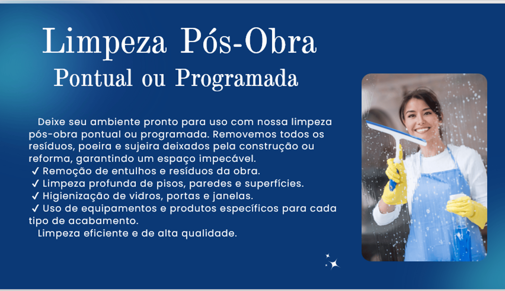 Somos uma empresa especializada na prestação de serviços de manutenção e limpeza, com um compromisso firme em garantir a qualidade e a excelência em cada projeto. Atuamos de forma estratégica e personalizada em diversos setores, como indústrias, varejo, condomínios, residências, escolas e outros estabelecimentos, sempre oferecendo soluções completas e eficientes para a manutenção de infraestrutura e ambientes.